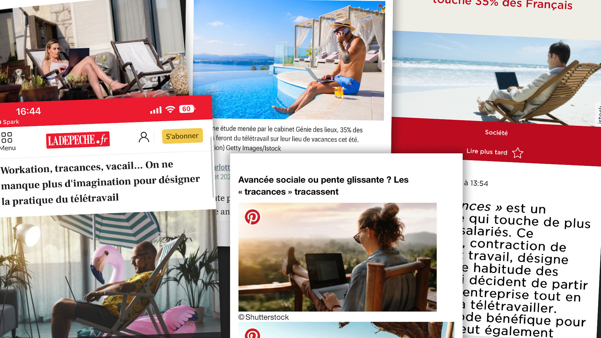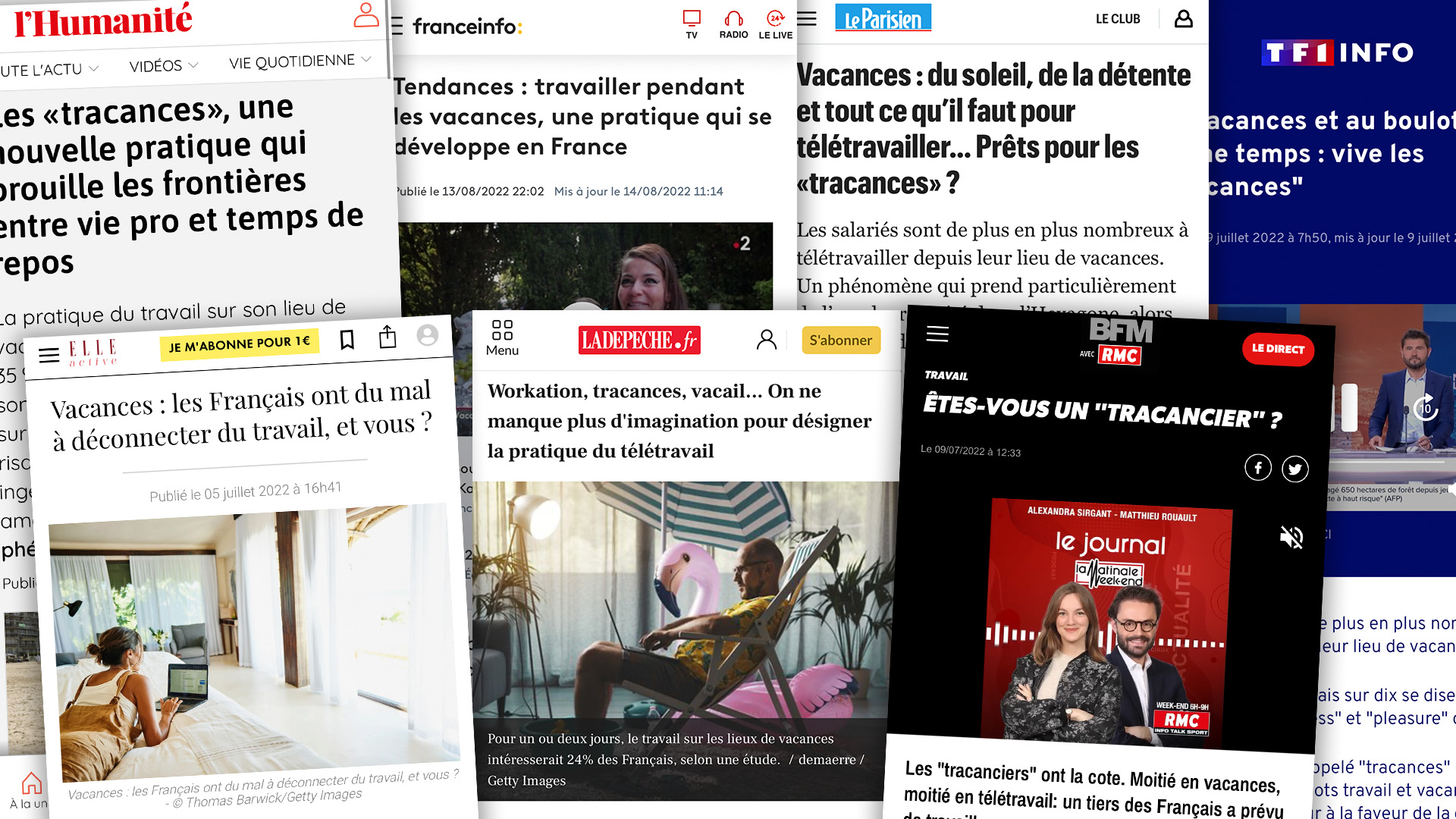 avant que les médias ne l'évoquent. RMC, Sud Radio ou encore Radio Classique affirment eux aussi que 35 % des Français auraient envisagé les "tracances" pour l'été 2022, tout comme TF1 ou Elle. La liste est longue, et le même schéma est répété par la plupart des rédactions. Avec toujours cette proportion, 35 %, brandie pour justifier le sujet, et des illustrations souvent issues de banques d'images, qui montrent de jeunes et beaux travailleurs pianotant sur le clavier de leurs ordinateurs dans des cadres idylliques.