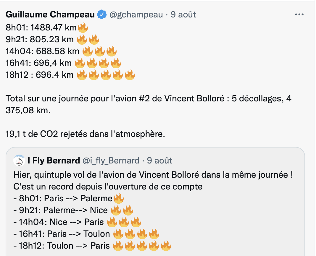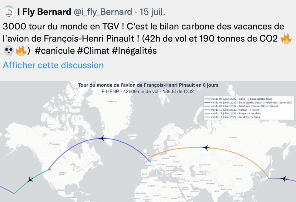 Il a recours aux immatriculations des avions, aux données des vols, calcule la consommation de fuel par heure de vol et l'émission de CO2 en kg par gallon de fuel brûlé. Il est suivi par 59 000 abonnés. En cet été de dérèglement climatique palpable, les révélations de ces comptes choquent. Oui, l'avion de Vincent Bolloré (Vivendi), a bien effectué cinq vols en une journée le 8 août dernier. Oui, triple vol pour l'avion de François-Henri Pinault, PDG de Kering (Paris-Rome, Rome-Saint-Malo, Saint-Malo-Paris) dans la seule journée du 22 juillet. Etc.