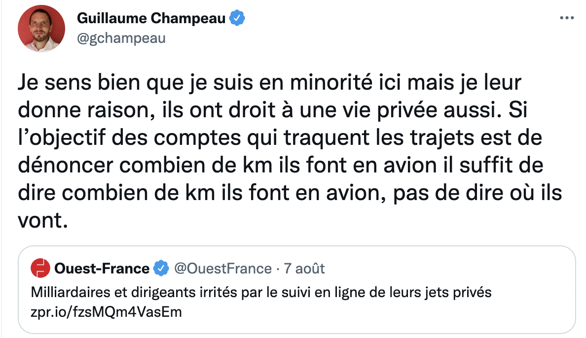 : c’est vrai. Mais on demande régulièrement des efforts d'économies d'énergie aux gens ordinaires alors que ces grands patrons réchauffent constamment le climat, bien plus qu'eux, émettant parfois en une journée ce qu'un Français émet en un an. L’avion de Bolloré a fait jusqu’à cinq vols par jour ! Si on joue selon leurs règles du jeu, on ne fera jamais rien pour l’environnement. Il faut armer notre camp en faisant savoir que des milliardaires font Paris-Bordeaux en avion alors que ça prend deux heures en TGV. À se mettre des barrières de cette sorte, on risque d'empêcher une mobilisation intéressante. Mais oui, c'est exact, je ne veux pas être traqué quand je vais acheter mon pain.