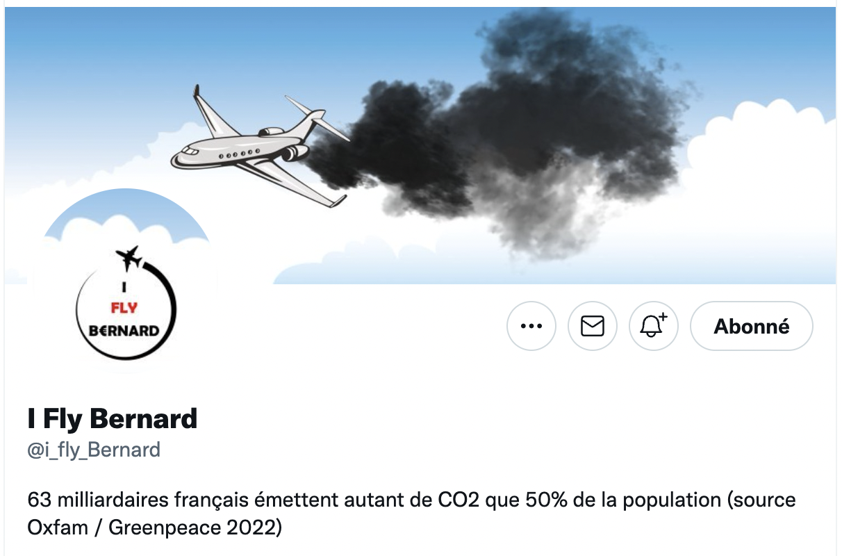 "I Fly Bernard" traque "les avions du groupe Bolloré (F-GBOL et F-HVBL), de François-Henri Pinault (F-HFHP), de Martin Bouygues (F-HMBY), du groupe Decaux (F-HJJJ) et bien sûr notre ami Bernard Arnault (F-GVMA)".