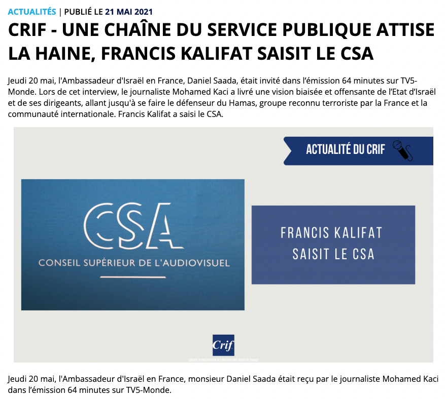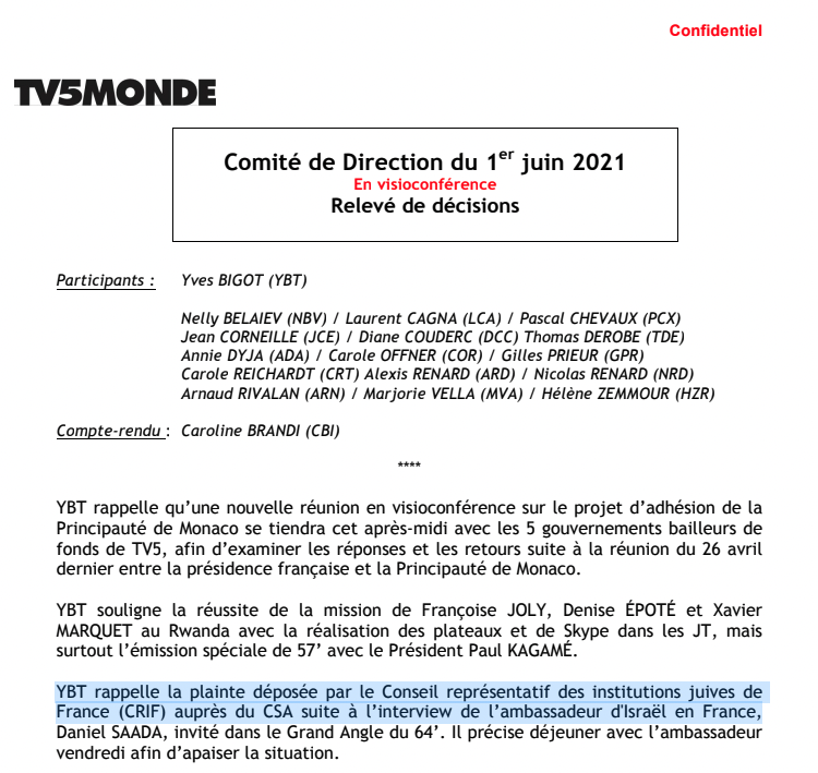 Pourtant, lors du comité de direction de TV5 Monde qui s'est tenu en visio-conférence le 1er juin 2021 et dont ASI a obtenu le compte-rendu confidentiel, le PDG Yves Bigot a bien fait état de la saisine du CSA par le Crif. Tout le personnel, y compris Françoise Joly, ont été destinataires de ce document. Il y est écrit : "Yves Bigot rappelle la plainte déposée par le Conseil représentatif des institutions juives de France auprès du CSA suite à l'interview de l'ambassadeur d'Israël en France, Daniel SAADA, invité dans le Grand Angle du 64. Il précise déjeuner avec l'ambassadeur vendredi afin d'apaiser la situation".