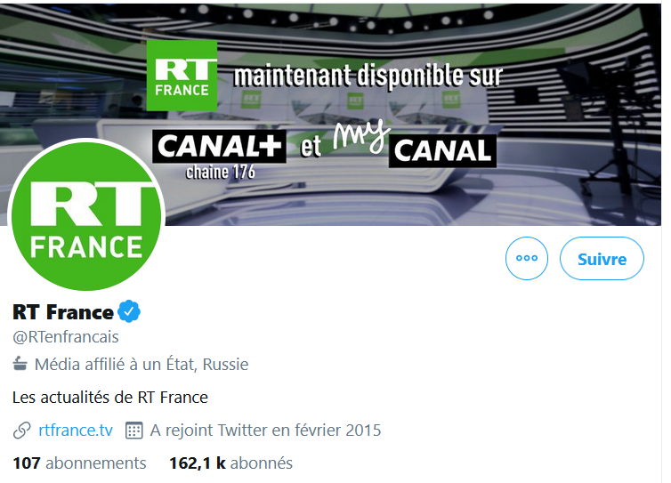 . C'est désormais ce que l'on peut voir affiché sur la page Twitter du compte RT France, comme sur celle de RT en anglais. Depuis ce jeudi 6 août 2020, Twitter a en effet mis à jour le réseau social pour y inclure des "nouveaux labels pour les comptes gouvernementaux et les médias d’État"
