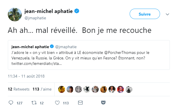 ". De son côté Aphatie n'a pas supprimé son tweet, mais l'a commenté d'un "Ah ah... mal réveillé. Bon je me recouche