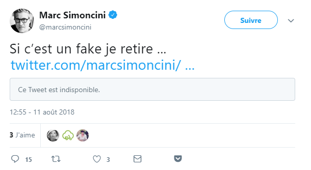 " en diffusant ce compte parodique. Rapidement, d'ailleurs le retweet de Grossiord a disparu. Le créateur de Meetic, Marc Simoncini, a lui retiré son tweet reprenant la fausse citation du "Merdia", accompagnant sa suppression d'un "si c'est un fake, je retire