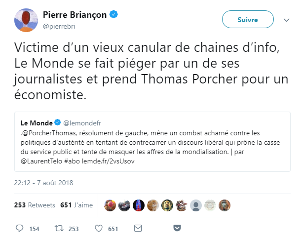 Un portrait plutôt bienveillant, donc, et qui témoigne surtout d'une stratégie de notoriété exemplaire de l'ère des réseaux sociaux : c'est en ferraillant sur Twitter, que Thomas Porcher s'est ouvert les portes des plateaux de télévision, et c'est sa présence sur ces plateaux qui, à son tour, lui a ouvert la légitimation d'un portrait dans Le Monde