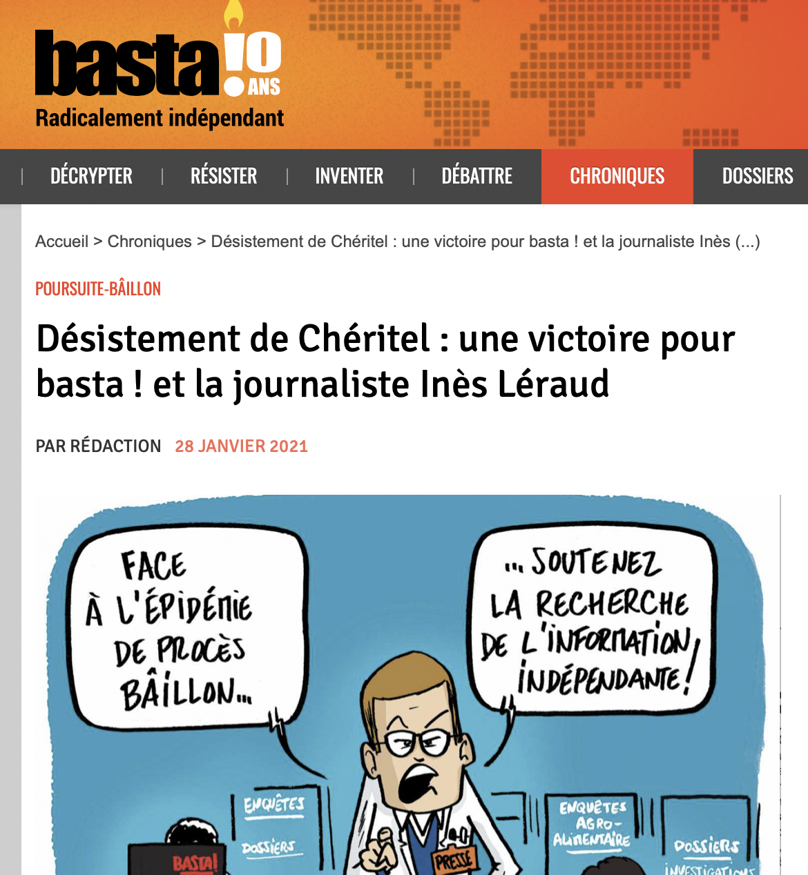 Et puis il y a tout ce qui s'est passé autour de mon travail en presse écrite. En mai 2020, un collectif de journalistes, militants associatifs, agriculteurs, scientifiques, avocats, syndicalistes, élus, m'a soutenue publiquement parce que j'étais visée par plusieurs plaintes en diffamation de l'industrie agroalimentaire, et parce que j'avais été déprogrammée d'un salon du livre en Bretagne où j'étais invitée pour ma bande dessinée Algues vertes, l'histoire interdite