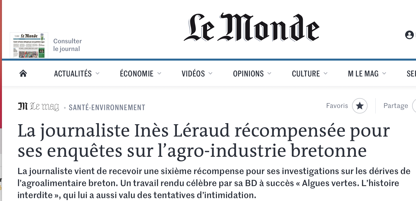 Des plages envahies d'algues vertes pestilentielles et toxiques, dont les émanations sont suspectées d'avoir provoqué plusieurs décès ; des algues vertes qui proviennent d'un excès de nitrates dans les sols et cours d'eau, nitrates issus des déjections animales bovines et porcines, et des engrais agricoles. C'est ce visage peu riant de la Bretagne que la journaliste Inès Léraud a fait connaître au grand public grâce à sa BD Algues vertes, l'histoire interdite