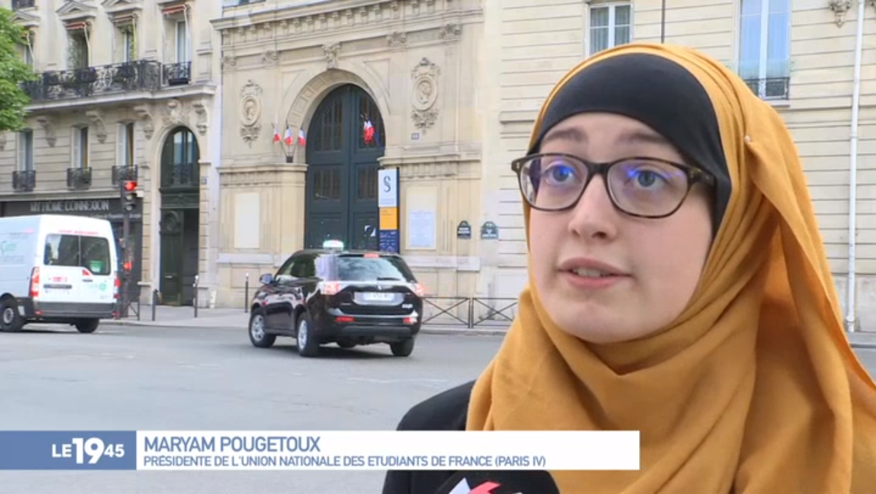 Poussée d'hystérie dans les médias autour du hijab de la présidente de l'Unef Paris IV Maryam Pougetoux. Déclenchée le 12 Mai après l'apparition de cette étudiante dans le JT de M6, où elle contestait la réforme de la sélection à l'université, la polémique ne cesse d'alimenter les plateaux TV et les journaux.