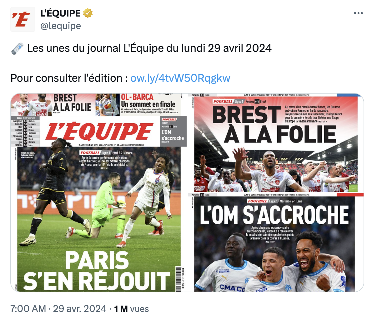 Trois fois plus reléguées au second plan ? Pour son édition papier du 29 avril 2024, l'Équipe a décliné sa Une en trois versions différentes, en fonction des régions dans lesquelles le premier - et seul - quotidien sportif français est distribué. Selon que soyez habitant du Sud, de l'Ouest, ou du reste de la France, vous avez donc pu apercevoir, en Une de l'Équipe, la victoire (en foot) de Lyon sur Monaco, celle de Brest sur Rennes, ou de Marseille sur Nice.