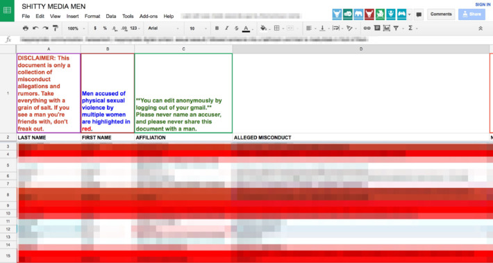 . Et listés en face des noms, des faits d’inconduite sexuelle — allant d’un flirt déplacé dans un cadre professionnel, à du harcèlement, des agressions, des violences physiques, et même des viols. Une liste compilée et alimentée par des comptes anonymes se connectant un à un au Google doc. Le nom de cette liste? “Shitty Media Men