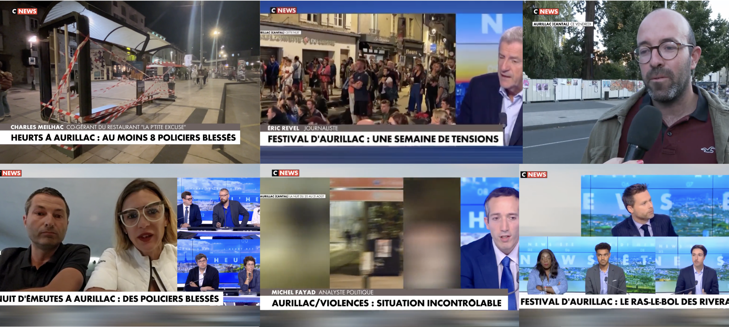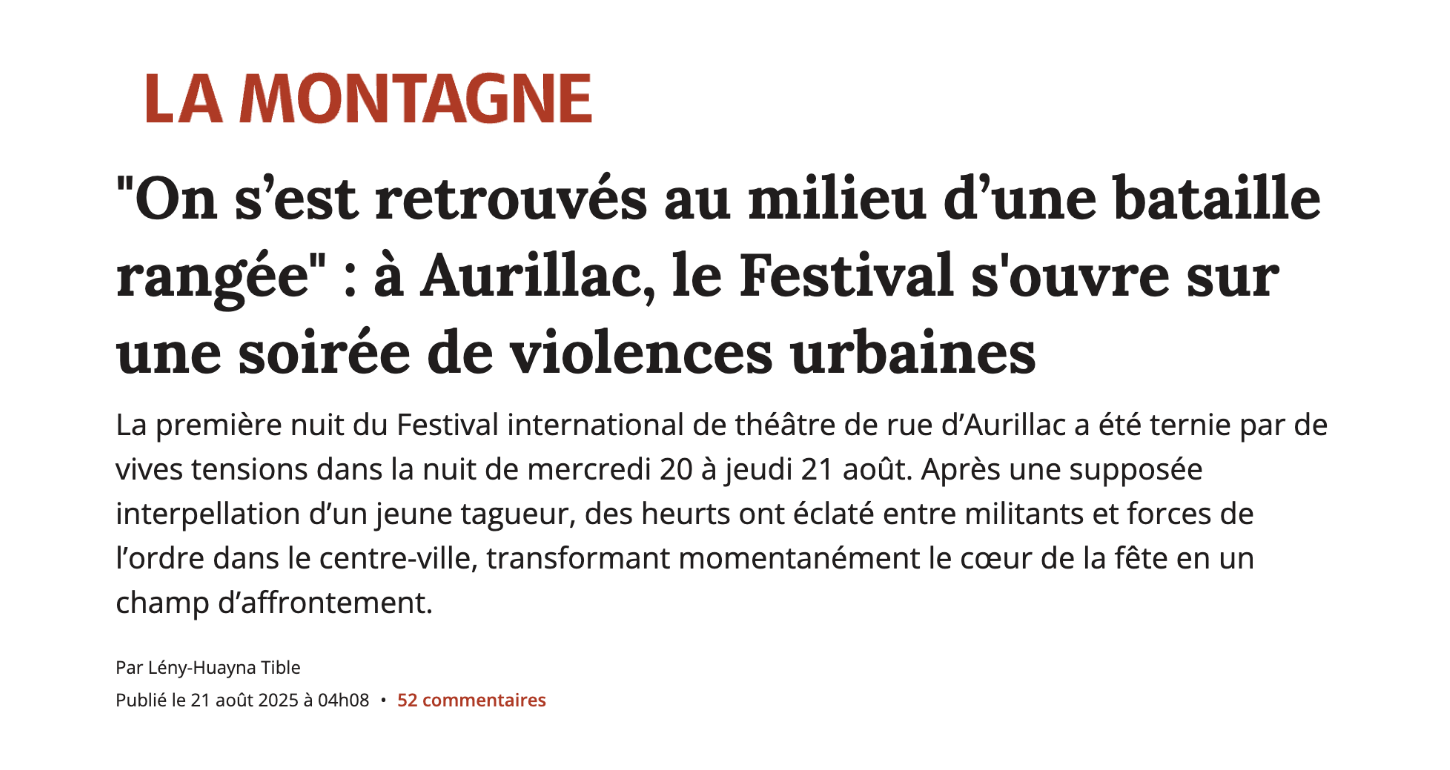 Tout va bien ma chérie ? J'ai vu les émeutes aux infos". Elle lève les yeux au ciel : elle était présente à Aurillac, cette nuit du 20 au 21 août, au festival d'art de rues. Un rendez-vous sur quatre jours, réunissant cette année 3000 artistes et 180000 spectateur·ices, où, selon la presse, "
