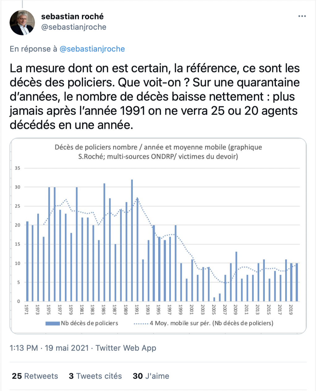 Dans un thread publié sur Twitter ce mercredi 19 mai, Roché pointe du doigt les amalgames faits par Darmanin : "Les chiffres fiables disponibles sont peu nombreux, et ils portent sur les décès. Mais, il n’existe pas de chiffre fiable concernant les blessures infligées aux policiers. Terme qui est en général confondu avec les agressions de policiers (qui ne sont pas dénombrées non plus)." Pour lui, les décès sont tout simplement les données les plus fiables : "Il est impossible que dans le même temps il y ait plus d’agressions violentes et que les décès de policiers baissent, écrit-il sur Twitter. La mesure dont on est certain, la référence, ce sont les décès des policiers. Que voit-on ? Sur une quarantaine d’années, le nombre de décès baisse nettement : plus jamais après l’année 1991 on ne verra 25 ou 20 agents décédés en une année."