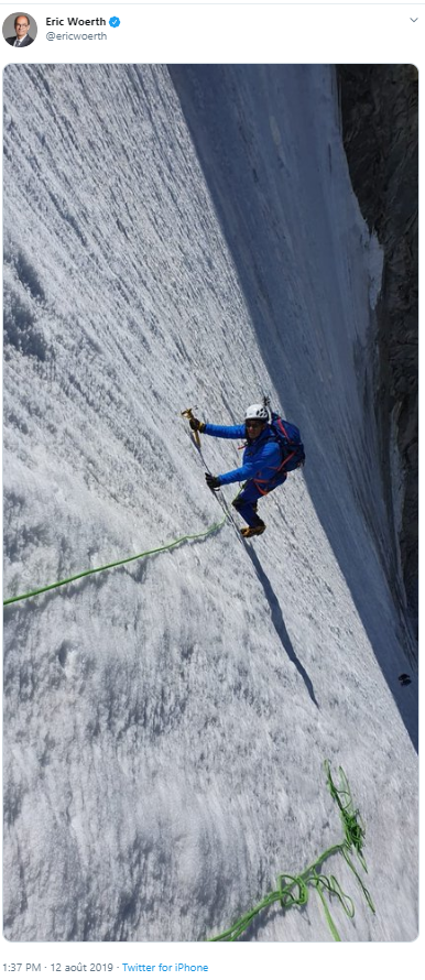 C'est un petit emballement médiatique de l'été, sur fond de glacier : le 12 août à 13h37, l'ancien ministre du Budget de Nicolas Sarkozy Eric Woerth publie sur son compte Twitter une photo de ses vacances. Sur le cliché, on observe l'ancien ministre, en tenue d'alpiniste, sur le Glacier du Milieu à l'aiguille d'Argentière (Haute Savoie).