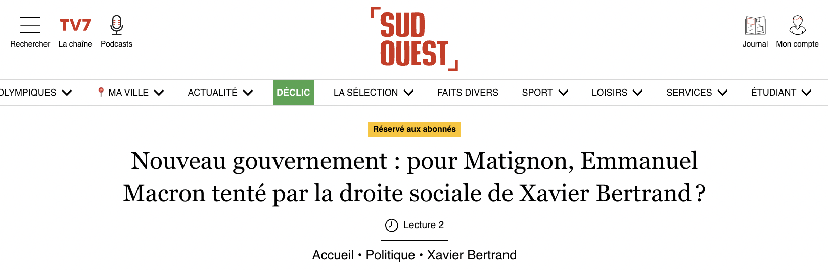 La "droite sociale". C'est donc le qualificatif qui ressort quand il s'agit de vendre la pertinence de l'hypothèse Xavier Bertrand à Matignon. Sur ce point, les journalistes politiques reprennent à leur compte les éléments de langage des proches de Bertrand. On a pu lire le 6 août dans Sud Ouest