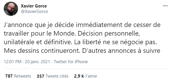 Le lendemain le 20 janvier, le dessinateur annonce sur Twitter "cesser de travailler pour Le Monde" en citant une "décision personnelle, unilatérale et définitive".
