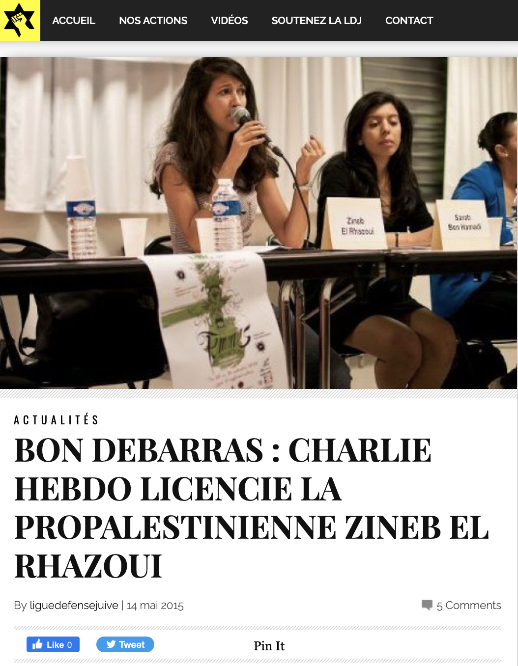 . En 2015, la Ligue de défense juive (LDJ) se félicitait d'ailleurs du licenciement de Zineb El Rhazoui, "la pro-palestinienne".