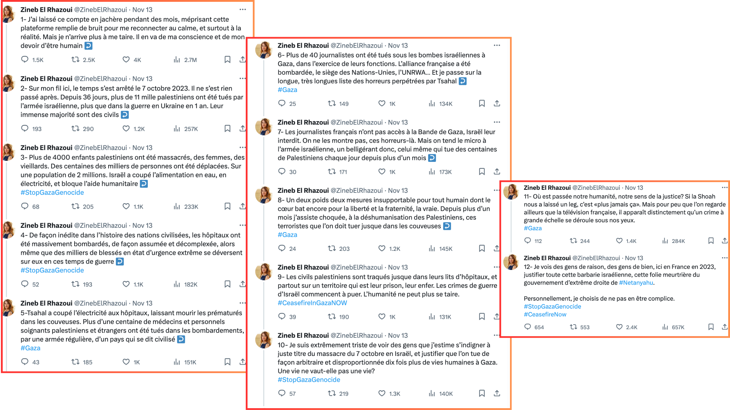 Au fil des tweets récents de Zineb El Rhazoui, de nombreux partages d'images effroyables de victimes des bombardements israéliens ("Images insupportables d'enfants palestiniens brûlés, mutilés, traumatisés à