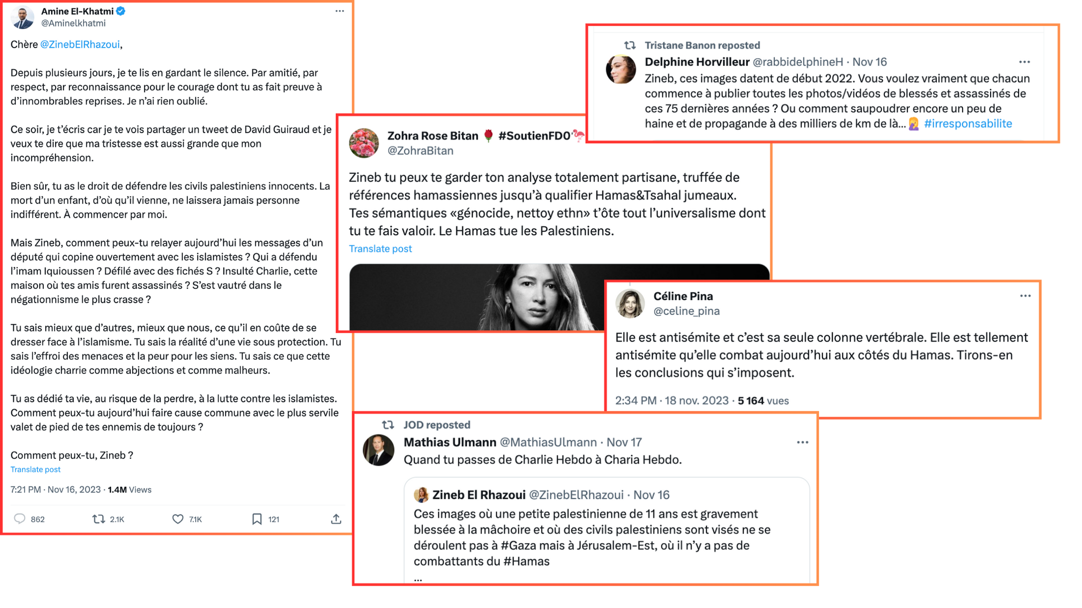 Tremblement de terre dans le microcosme twitto- journalistique : après un long silence médiatique et un compte Twitter en veille depuis décembre 2022, la polémiste Zineb El Rhazoui s'est fendue d'un tweet qui a eu l'effet d'une petite bombe. Le 13 novembre, elle publiait un thread pour crier son indignation face à la "folie meurtrière du gouvernement d'extrême droite de