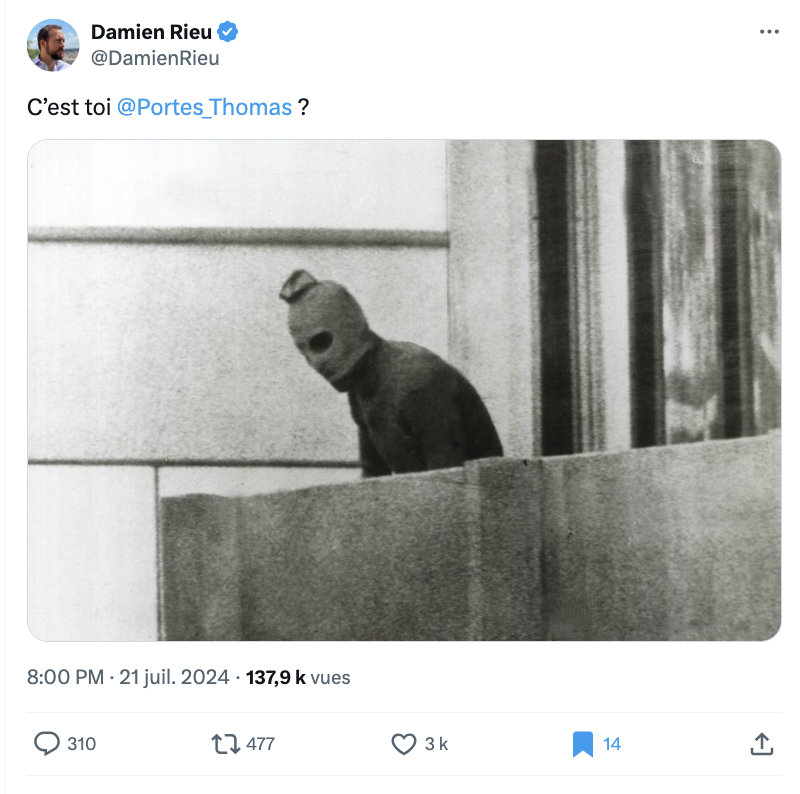 Les outrances se poursuivent avec Damien Rieu, qui tweete "C'est toi Thomas Portes ?"