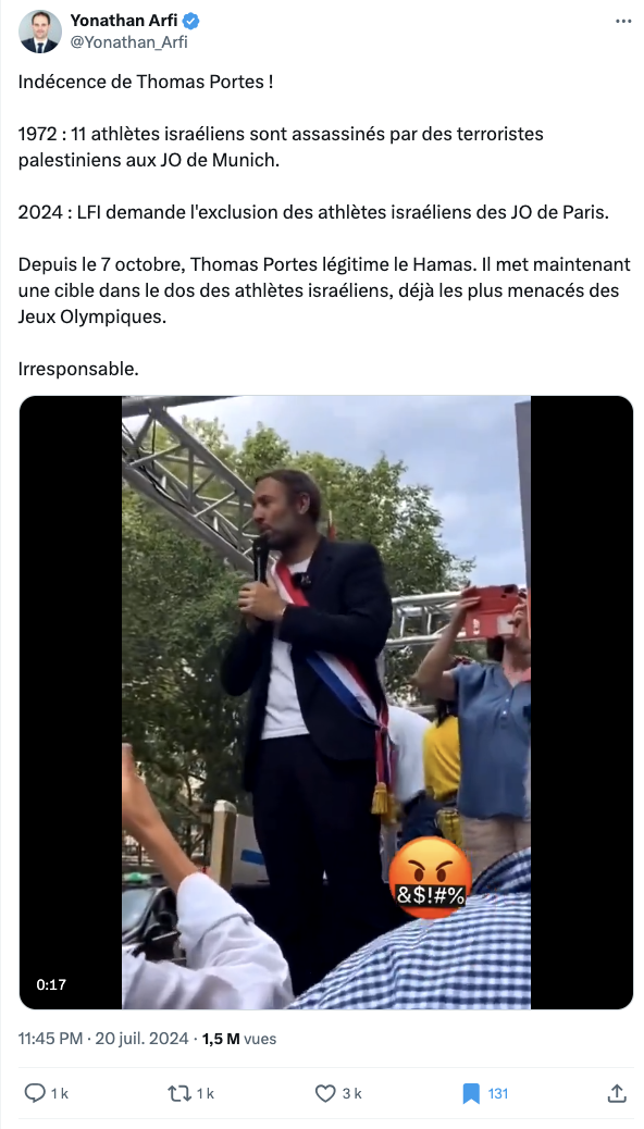 . Arfi va jusqu'à dresser un parallèle avec les tragiques attentats des JO Munich en 1972, lors desquels onze athlètes israéliens avaient été assassinés par l'organisation palestinienne Septembre noir - instillant ainsi l'idée que les propos de l'élu constituent un appel à la violence.
