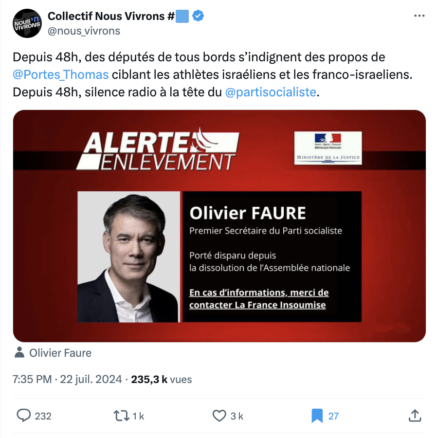 la position de Thomas Portes, avant d'expliciter une position qui se trouve être... exactement celle du député du 93. Difficile de plaider la méconnaissance alors que le député de la Somme signait à ses côtés, quelques mois plus tôt, un courrier destiné au Comité international olympique pour réclamer des sanctions contre Israël. Alors pourquoi ce désaccord de façade ? Difficile de ne pas y voir une simple posture pour s'éloigner de LFI et d'un camarade vilipendé de toutes parts.