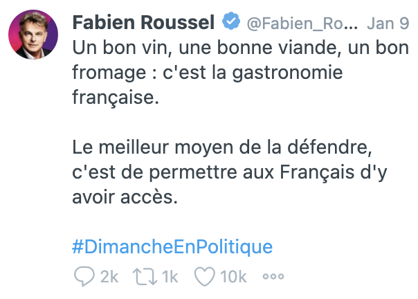 "«Un bon vin, une bonne viande, un bon fromage !». Qui aurait cru qu'en 2022, c'est ce que l'on retiendrait de la campagne du PCF à la présidentielle ?", tweetait il y a peu l'auteur et militant Aymeric Caron. Difficile de dire si c'est du lard ou du cochon mais celui qui vient de rallier Jean-Luc Mélenchon risque de ne pas avoir complètement tort. Dimanche 9 janvier après-midi, un tweet de 4 lignes du candidat PCF à la présidentielle a mis le feu aux poudres :