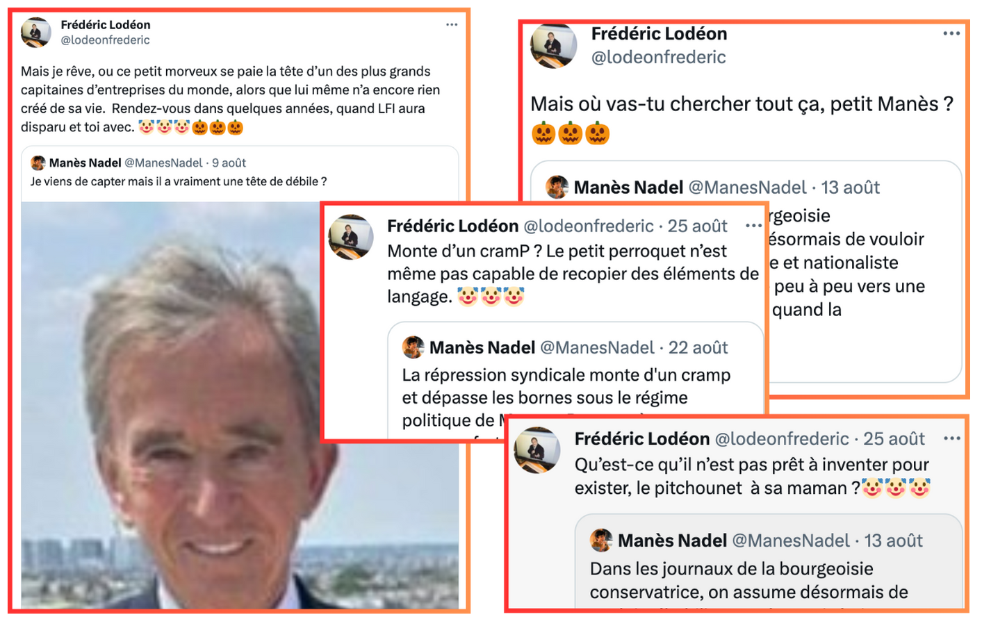 Non content de produire plusieurs tweets en réponse à Nadel qui se moquait de Bernard Arnault, Lodéon s'était amusé à afficher son visage plein pot dans une publication moqueuse. Et à republier sans aucun discernement tous les commentaires – du même niveau que les siens – reçus en réponse.