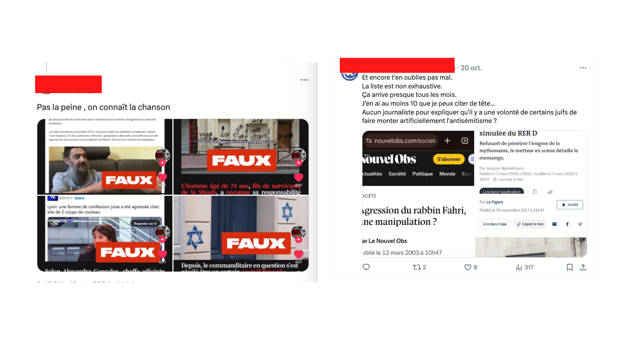 mais avec trois exemples cités sur quatre datant d'entre 10 et 20 ans. Surtout, l'internaute qui flirte avec le complotisme, oublie que dans la majorité des cas, ces histoires de faux témoignages relèvent de mobiles personnels et non politiques. Ce fut le cas, en juillet 2023 lorsque des tags antisémites inscrits sur la devanture d'un restaurant casher à Levallois-Perret avaient suscité une grande indignation politico-médiatique, avant que l'on apprenne que le propriétaire du local (lui-même juif) était à l'origine de ces tags à cause d'un différend commercial avec son locataire. Quelques mois plus tard, une quadragénaire inventait une agression antisémite pour cacher son addiction aux jeux d’argent. Des affaires qui rappellent un cas d'école vieux de vingt ans où une jeune femme avait inventé son agression antisémite dans le RER D. Si leur existence n'est absolument pas incompatible avec un antisémitisme bien réel et recrudescent, ces histoires participent à un climat de suspicion.