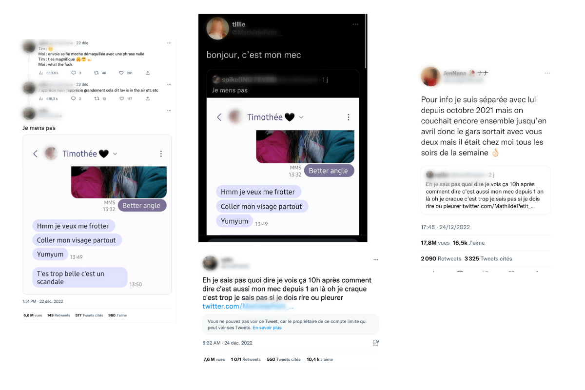 C'est le genre d'histoires à rebondissements made in Twitter (un "drama" dans le jargon) dont les twittos raffolent, bien inconscients des conséquences que peuvent avoir leurs likes. Le 25 décembre, ils se sont délectés d'un feuilleton qu'on résumera ainsi : deux jeunes femmes se rendent compte par tweets interposés qu'elles partagent le même petit ami (Timothée). La divulgation publique de cette tromperie devient virale : plus de sept millions de vues pour le tweet de l'une d'elles découvrant le pot aux roses et 18 millions de vues pour celui d'une troisième, prétendant avoir également fréquenté le jeune homme sur la même période.