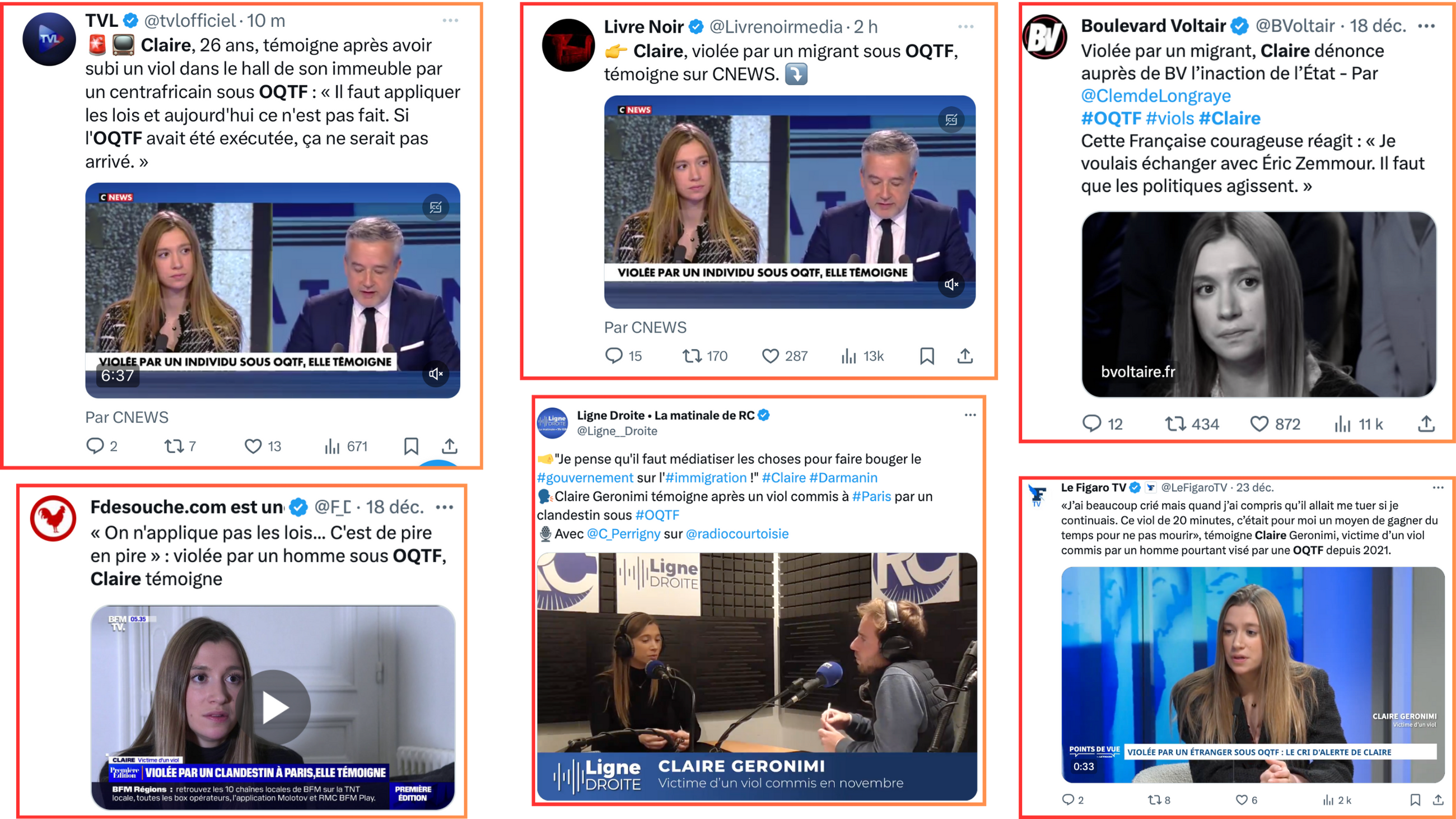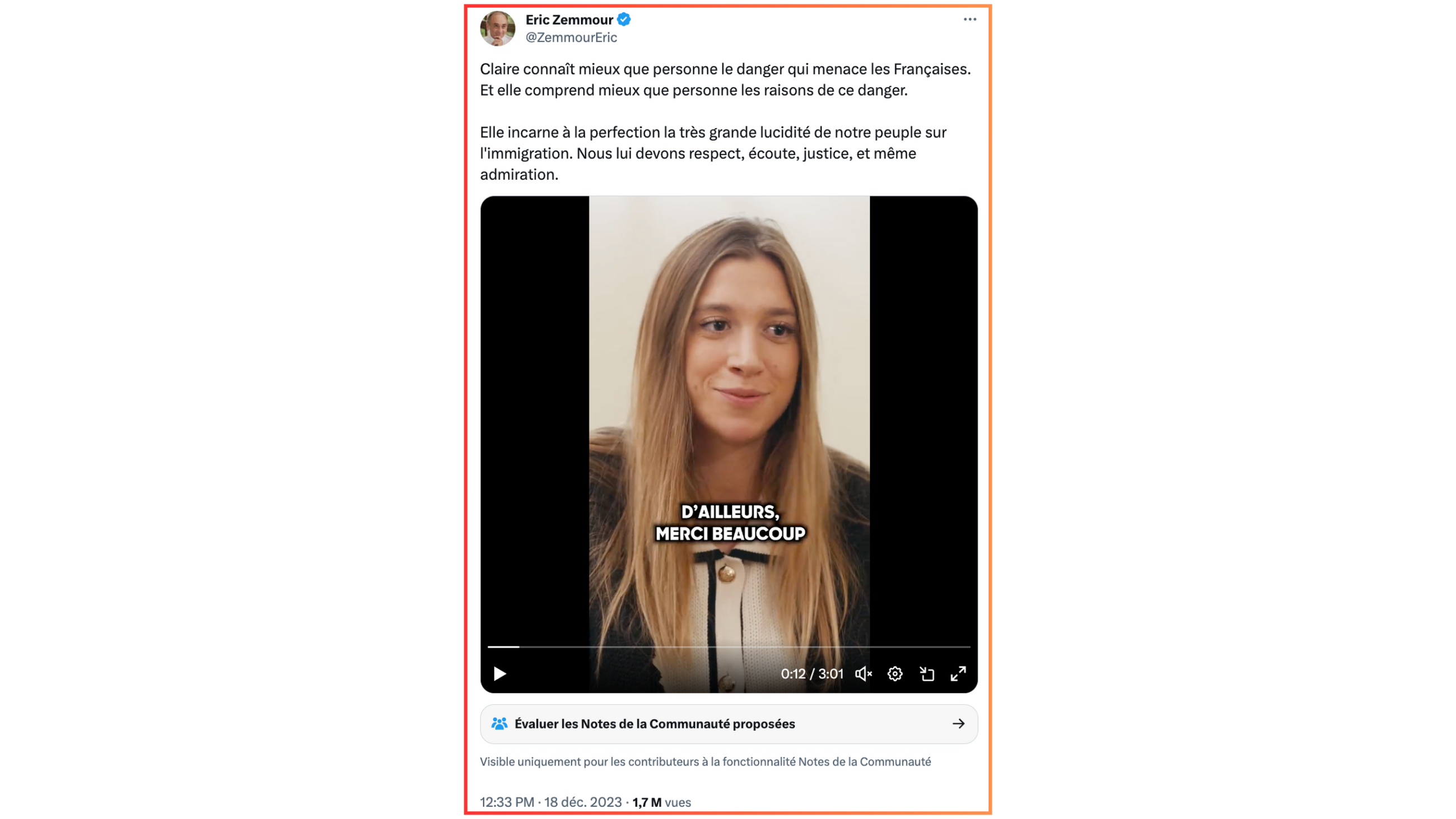 Ce 18 décembre, le témoignage de Claire apparait aussi sur les comptes en ligne d'Éric Zemmour.