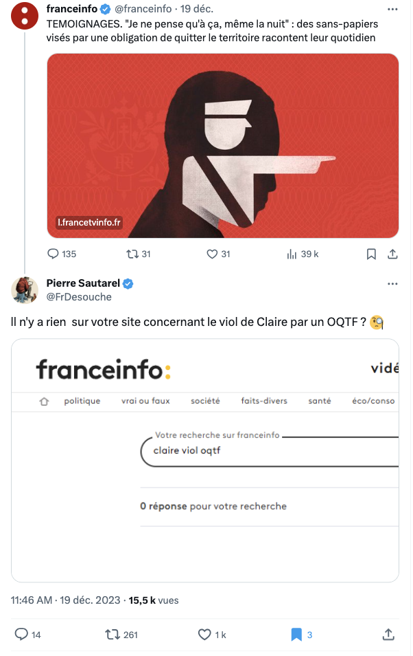 "Pourquoi préciser que l'agresseur est sous OQTF ? Une agression commise par un étranger est-elle plus grave que celle commise par un Français ?" questionne Rafik Chekkat, fondateur de la plateforme islamophobia.fr. À son message, de nombreux internautes répondent que si l'obligation de quitter le territoire avait été appliquée, le viol n'aurait pas eu lieu. Mais si c'est factuellement vrai, cela occulte complètement les enjeux des violences sexistes et sexuelles (VSS) en France en se focalisant sur un cas particulier. Rappelons, puisque cela semble nécessaire, que la presse regorge d'histoires de personnes étrangères absolument irréprochables, ou réellement menacées dans leurs pays d'origine, et pourtant visées par une OQTF (au hasard, ici, ici, ici, ou encore ici).
