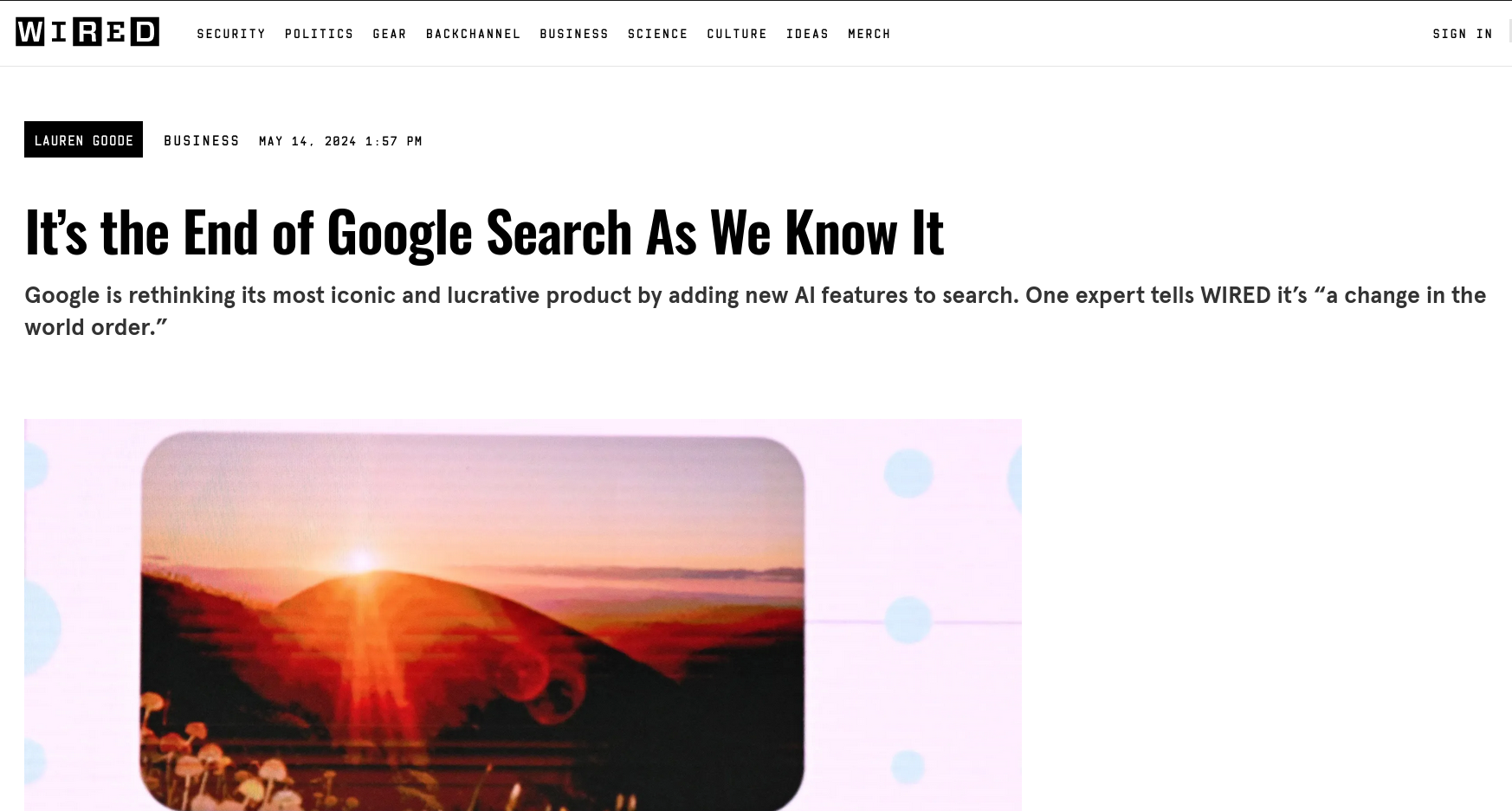 "Google will do the Googling for you" – laissez Google googler des trucs sur Google à votre place. Ne vous laissez pas tromper par le ton câjoleur : ce n'est pas une invitation. C'est une mise à jour, unilatérale, des termes du contrat social que nous avons passé avec le géant étatsunien. Le 14 mai, lors de sa keynote annuelle Google I/O, où le mot "IA" aura été prononcé 121 fois en deux heures, Google a décidé que le paradigme de la recherche d'informations avait changé, et c'est comme ça. Première déflagration : dans l'affichage par défaut du moteur de recherche, c'est désormais Gemini, le grand modèle de langage (LLM) de Google, qui