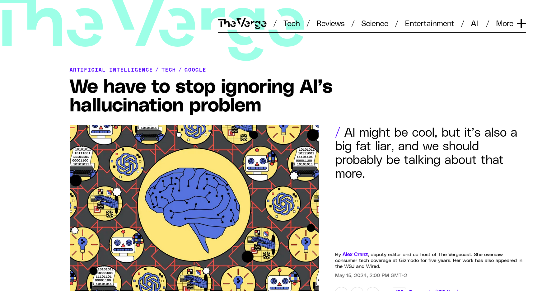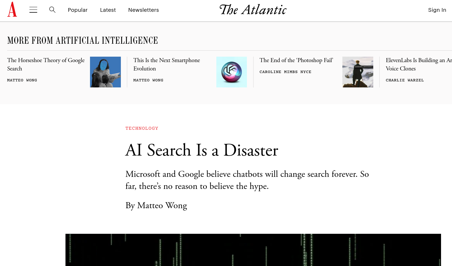 Sauf que les logiciels ne sont pas des enfants et que pendant ce temps-là, la recherche par IA est un désastre, résume The Atlantic. En février 2023, Google tentait déjà de nous montrer que son chatbot Bard pouvait remplacer son moteur de recherche – première démo, premier désastre, et 100 milliards de dollars de capitalisation boursière évaporés. Fin 2023, on apprenait que le chatbot Bing, que Microsoft (qui possède OpenAI) a intégré à son moteur de recherche avec des résultats désastreux, hallucine des résultats d'élections une fois sur 3 et n'est même pas foutu de donner correctement l'année - pas le jour ou l'heure, non, l'année.