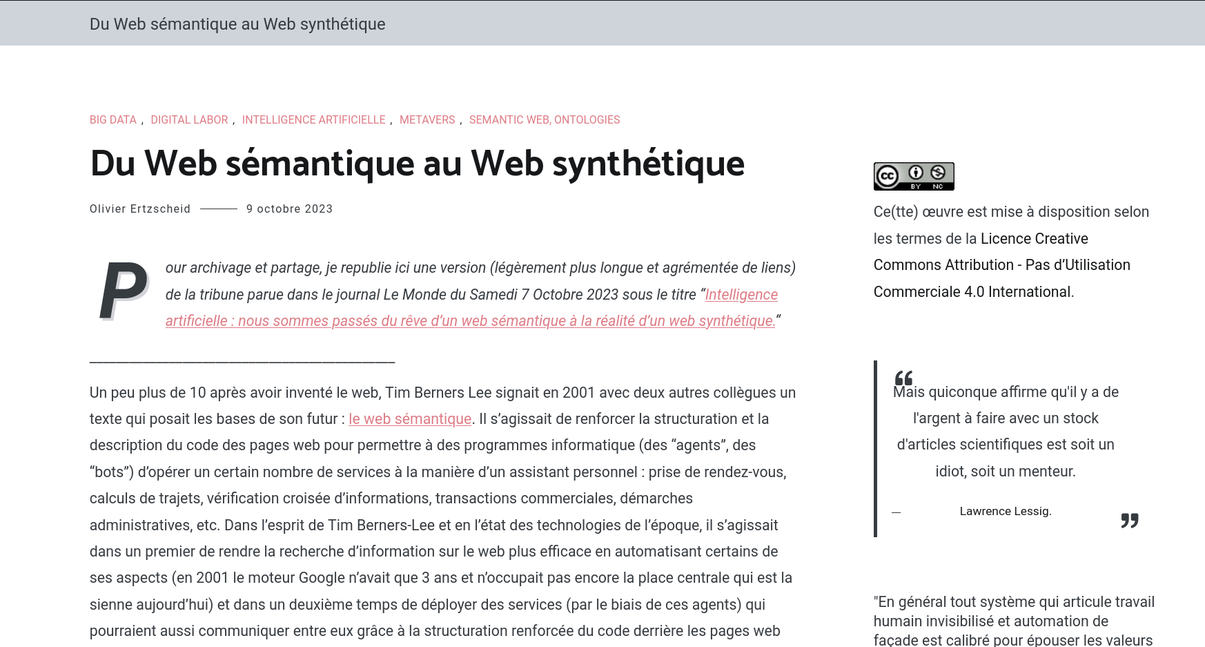Depuis, Google essaie de devenir un site dont on ne sort pas, une sorte d'OS du Web. Son obsession, c'est celle du résultat "zero-click", où Google vous répond sur Google, sans que vous ayez à quitter Google – dans le Monde, Ertzscheid appelle ça un "moteur de réponse". En basculant du Web sémantique au Web synthétique et après avoir raflé tout ce que le Web a produit de textes publiquement accessibles, Google se sent prêt à remplacer les sites Web qu'il indexe depuis 25 ans avec ses machines à régurgiter du polyester informationnel, et à remplacer ses utilisateurs par des machines à naviguer cette déchetterie. Des robots posent des questions, des robots produisent des réponses. Mais qui produit l'information que les robots résument, et que se passera-t-il lorsque le jardin emmuré de Google se sera hermétiquement scellé au-dessus de nos têtes? Google ne se pose pas la question. Google n'a plus besoin de nous. Le contrat avec les êtres humains d'Internet - trafic et référencement contre exploitation publicitaire- est nul et non avenu. Les prochains mois seront un (enième) carnage économique. Mais Google s'en fout. Google détient 90, 1% du marché de la recherche en ligne. Google est un monopole. Il ne craint ni la régulation, ni la compétition, ni l'échec commercial. Il n'a même plus besoin que son service soit fiable. Google peut s'auto-mutiler sans sourciller. Le Web sémantique et le Web synthétique se dissolvent dans son Web monopolistique. Que vous le vouliez ou non, Google va mal googler des trucs à votre place sur Google. Google va vous résumer le monde comme il veut. Google va vous conseiller de boire votre pisse pour vous guérir du cancer. Et vous allez écouter, sans sourciller. Ainsi va le monopole.