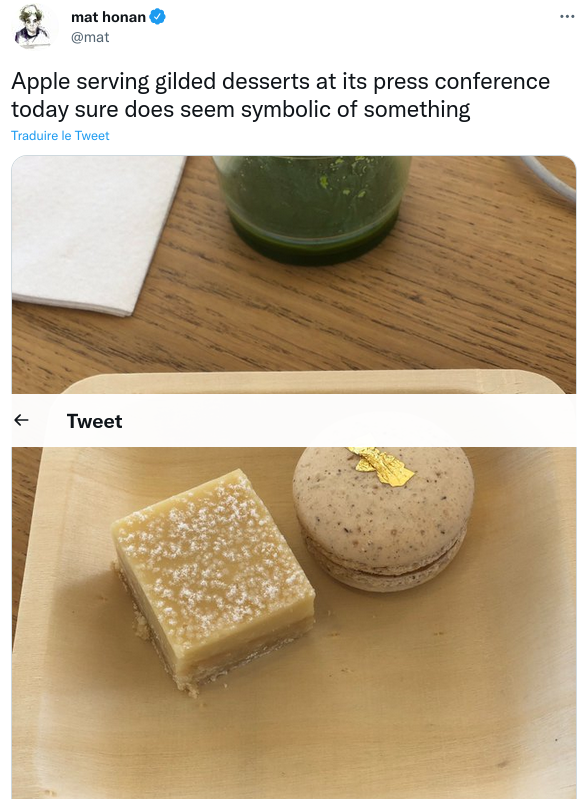 Forcément, quand je regarde les productions des confrères et consœurs lors de la dernière keynote, je repense à tout ça – même si j'espère de tout mon cœur que les temps ont changé, et que les journalistes présent·es cette année l'ont fait par leurs propres moyens. Je repense à cet emmaillotage des journalistes tech dans un corset d'enthousiasme, de cadeaux, de luxe minimaliste et de petits desserts décorés à la feuille d'or. Le journalisme tech paie mal, rend précaire, et oblige souvent à travailler pour des pure players en totale dépendance économique avec ce genre de paquebots du capitalisme, qui font et défont des rédactions à chaque mise à jour de leurs agrégateur d'actualités.