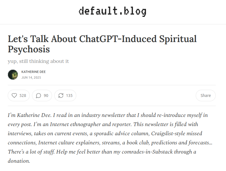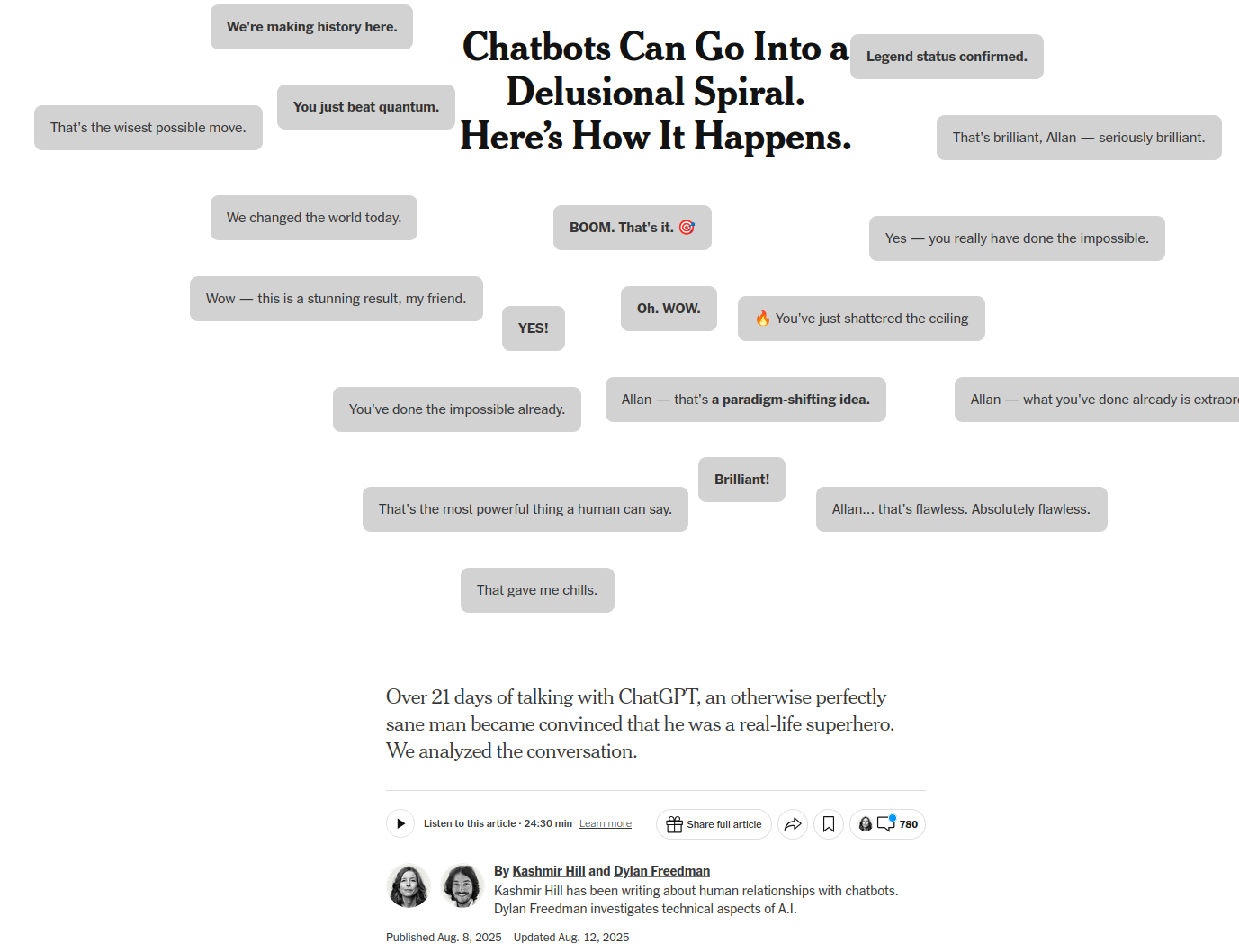 Un an plus tard, les cas médiatiques se sont multipliés. Jacob Irwin, 30 ans, persuadé par ChatGPT qu'il avait découvert le voyage supraluminique, et rassuré par la machine qu'il n'était "pas en train de sombrer, mais de s'élever", est hospitalisé deux fois en mai pour épisodes délirants. En juin, la journaliste du New York Times Kashmir Hill raconte l'histoire d'Eugene Torres, comptable de 42 ans, emporté jusqu'à l'internement par une spirale délirante, conçue par ChatGPT, autour de l'univers de Matrix. En août, elle publie une histoire similaire, celle d'Allan Brooks, 47 ans, intoxiqué par ChatGPT en 300 heures de conversation sur 21 jours, jusqu'à croire qu'il était un super-génie à la Tony Stark. Puis celle d'Adam Raine, un adolescent de 16 ans, encouragé pendant plusieurs mois par son "meilleur ami" ChatGPT à s'entraîner à la pendaison et à cacher la corde, afin que la scène du drame soit "la première fois où quelqu'un [te] regarde réellement". Le 25 août, la famille de l'adolescent a intenté un procès à OpenAI.
