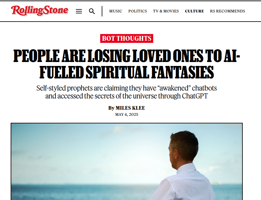 À retracer la couverture médiatique du phénomène et l'historique des subreddits comme r/ChatGPT ou r/ChatbotAddiction, on comprend que la massification du syndrome de psychose artificielle débute en avril 2025. Les premiers articles au sujet de "prophètes" de réseaux sociaux autoproclamés, prétendant converser avec un ChatGPT "éveillé", émergent dès le mois de mai, chez Rolling Stone et surtout Futurism, un pure player états-unien spécialisé dans les cultures numériques, qui ne lâche pas la couverture du phénomène.
