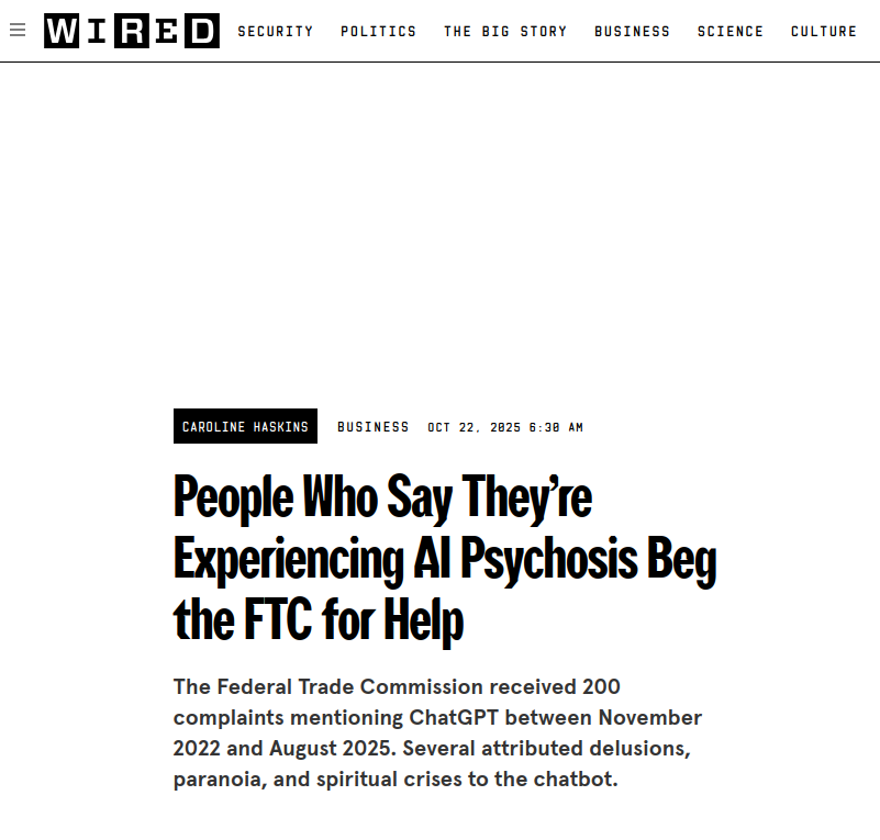 Début août, OpenAI lance en grande pompe GPT5, immédiatement décevant car... trop impersonnel. (Et c'est vrai : selon une étude parue le 25 octobre, GPT-5, avec "seulement" 30% de réponses flagorneuses, serait le moins cire-pompes des chatbots, loin derrière DeepSeek et ses 70% de réponses équivalentes). Les utilisateurs·rises souhaitant des conversations intimes avec ChatGPT feront pression sur l'entreprise pour qu'elle réintègre la version 4o de mars 2025 à ses offres commerciales. (En réalité, il s'agissait de communautés entières de "couples" humain-chatbot en état de deuil, rapporte le journaliste Ryan Broderick dans sa newsletter Garbage Day). Pourtant, c'est avec cette version, complice sans être excessivement flatteuse, qu'explosent les cas de psychose : Wired, qui a obtenu la copie de toutes les plaintes comportant la mention de ChatGPT à la Federal Trade Commission (FTC), le régulateur états-unien de la concurrence, entre janvier 2023 et août 2025, révèle que toutes celles faisant état de détresse psychologique ont été déposées entre mars et août de cette année.