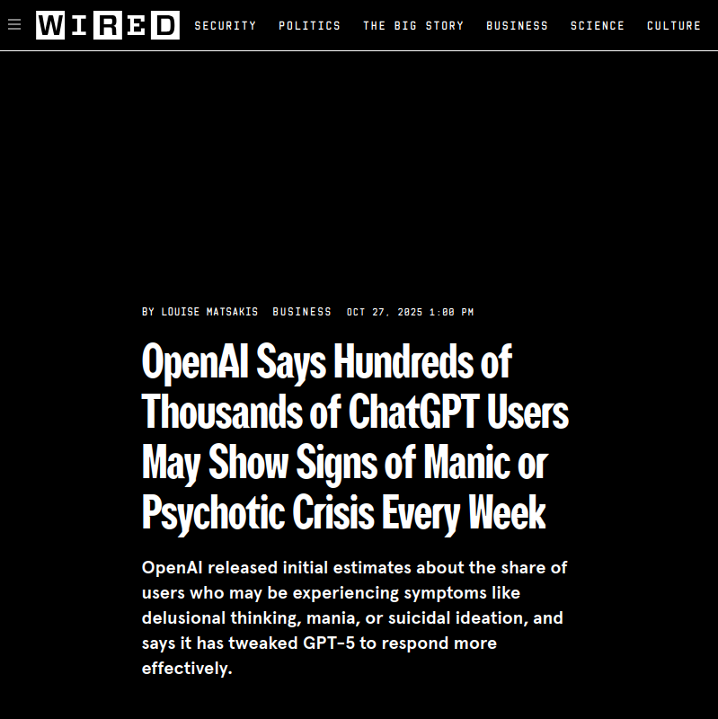 Alors, mois après mois, étude après étude, l'ampleur du phénomène se précise. Si Sam Altman affirmait au doigt mouillé, le 15 septembre, que moins d'1% des utilisateur·ices de ChatGPT avaient des interactions "malsaines", la firme estime désormais, le 27 octobre, que 0,07% de ses utilisateur·ices hebdomadaires actif·ves montrent des signes de psychose. Ça peut sembler dérisoire, mais n'oublions pas que ChatGPT compte 800 millions d'utilisateur·ices hebdomadaires. 0,07% de psychotiques, ça fait 560 000 personnes chaque semaine. Et ce sont les propres chiffres de l'entreprise.