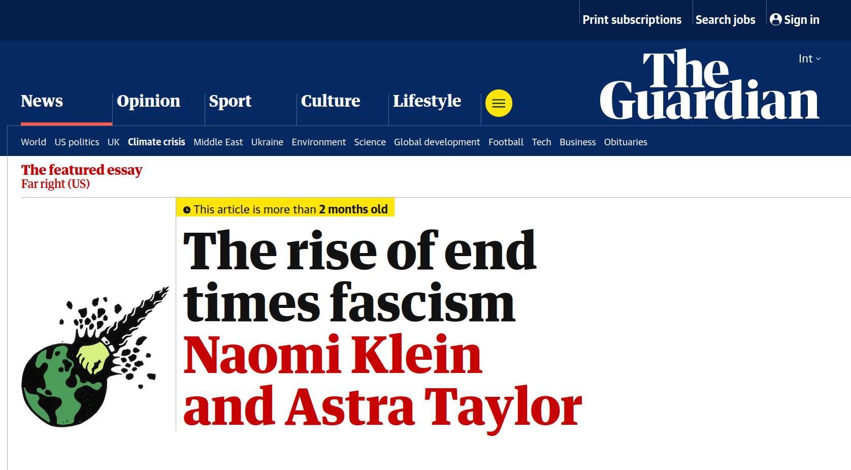 L'époque, crépusculaire et aliénée, tient son nouveau récit de puissance. Le "complexe d'Armageddon" identifié par Umberto Eco comme composante de l'"ur-fascisme", écrivent Klein et Taylor, "traverse les lignes de classe, unissant les milliardaires [de la tech] aux militants MAGA" des classes populaires, autour d'une sorte de nihilisme sadique, carnavalesque, orgiaque : puisque le monde se désintègre, autant laisser libre cours à ses pulsions libidineuses et tout saloper, tout détruire, tout extraire, tout cramer, tout consommer, avant de se barricader. Mais contrairement aux précédentes mythologies fascistes, du futurisme italien ivre de vitesse au "Reich de mille ans" promis par Hitler, ce fascisme de 2025 ne s'embarrasse même plus de quelconque promesse d'avenir grandiose. Il est entré dans sa phase punk - no future - et n'a plus comme proposition que la jouissance démente jusqu'à la carbonisation générale - la capitalypse.