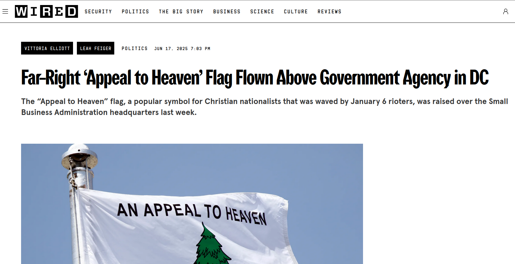 Les décors changent, l'Apocalypse se décline. Début juin à Washington, on pouvait voir flotter un étrange drapeau blanc ornée d'un sapin devant l'agence publique des petites entreprises (Small Business Administration). Son slogan, An Appeal to Heaven, est un cri de ralliement des nationalistes chrétiens, qui s'autodécrivent parfois comme des "sionistes chrétiens", et forment le trait d'union entre le trumpisme des émeutiers du Capitole et la frange religieuse la plus énervée de l'extrême-droite étasunienne. L'administration Trump, véritable véhicule pour l'agenda politique des suprémacistes chrétiens (et particulièrement du mouvement des "TheoBros", dont le vice-président J.D. Vance se réclame ouvertement), en adopte désormais la rhétorique messianique. En témoigne le texto halluciné envoyé le 17 juin dernier par Mike Huckabee, l'ambassadeur étasunien en Israël également pasteur évangéliste et chrétien sioniste, à son président Donald Trump, dans un contexte de tension géopolitique maximale : "je crois que vous allez entendre une voix venue du paradis, et que cette voix est plus importante que tout." Cinq jours plus tard, 125 avions étasuniens larguaient 75 bombes sur le sol iranien. Que Sa volonté soit faite, sur la terre comme au ciel.