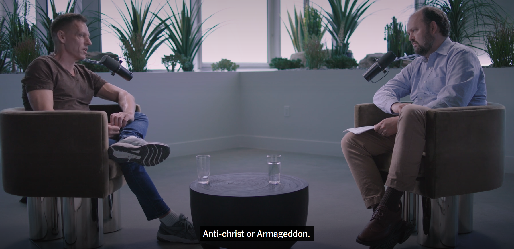 Or, Peter Thiel n'est pas que le grand architecte du technofascisme : c'est un prophète apocalyptique. En 2011, il annonçait déjà, dans la National Review conservatrice, "la fin du futur" - qui signifie, pour lui, la terreur d'une société redistributrice et décroissante. Début janvier, dans le Financial Times (!), le voilà qui affirme que "le retour de Trump à la Maison-Blanche augure l'apokálypsis des secrets de l'ancien régime", entendu ici comme la démocratie libérale honnie. Dans un autre entretien de décembre 2024 chez Uncommon Knowledge (un média spécialisé dans les longues interviews politiques, chapeauté par l'Institut Hoover, think-tank proche des républicains), il s'envole dans un monologue étrange au sujet du "spectre apocalyptique de l'Antéchrist et de l'Armageddon". En guise de candidats potentiels à l'Antéchrist, il cite tour à tour l'IA, le communisme, un "gouvernement mondial unique", Greta Thunberg, les agences de régulation, la décroissance et les États-Unis (!). Le voilà encore, le 26 juin, dans un rare entretien d'une heure au New York Times, à disserter à nouveau sur l'Apocalypse, l'Antéchrist, l'Armageddon et la nécessité existentielle de tout déréguler pour éviter la catastrophe de la "stagnation".