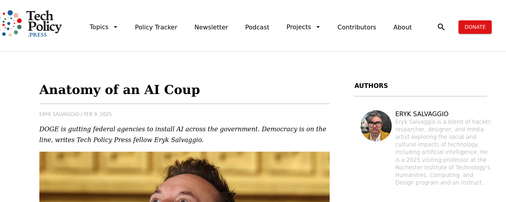 Alors, comme l'écrivait le spécialiste en cybersécurité Bruce Schneier pour The Atlantic dès février, il est temps de s'inquiéter sérieusement du projet techno-politique de DOGE. Utiliser des logiciels de traitement automatique de données (qu'on appelait encore hier "analyse big data" ou "apprentissage machine" et qu'on appelle désormais à tort et à travers "IA") en complément du personnel administratif, pour effectuer des tâches impossibles à l'intelligence humaine et améliorer le service public, n'a rien de fondamentalement problématique (cette approche de l'outil technique est celle dite du "centaure", telle que théorisée par Cory Doctorow). Mais le plan est ici tout autre : "remplacer le personnel humain par des machines", selon un cadre du gouvernement cité par le Washington Post, et "automatiser tout ce qui peut l'être."