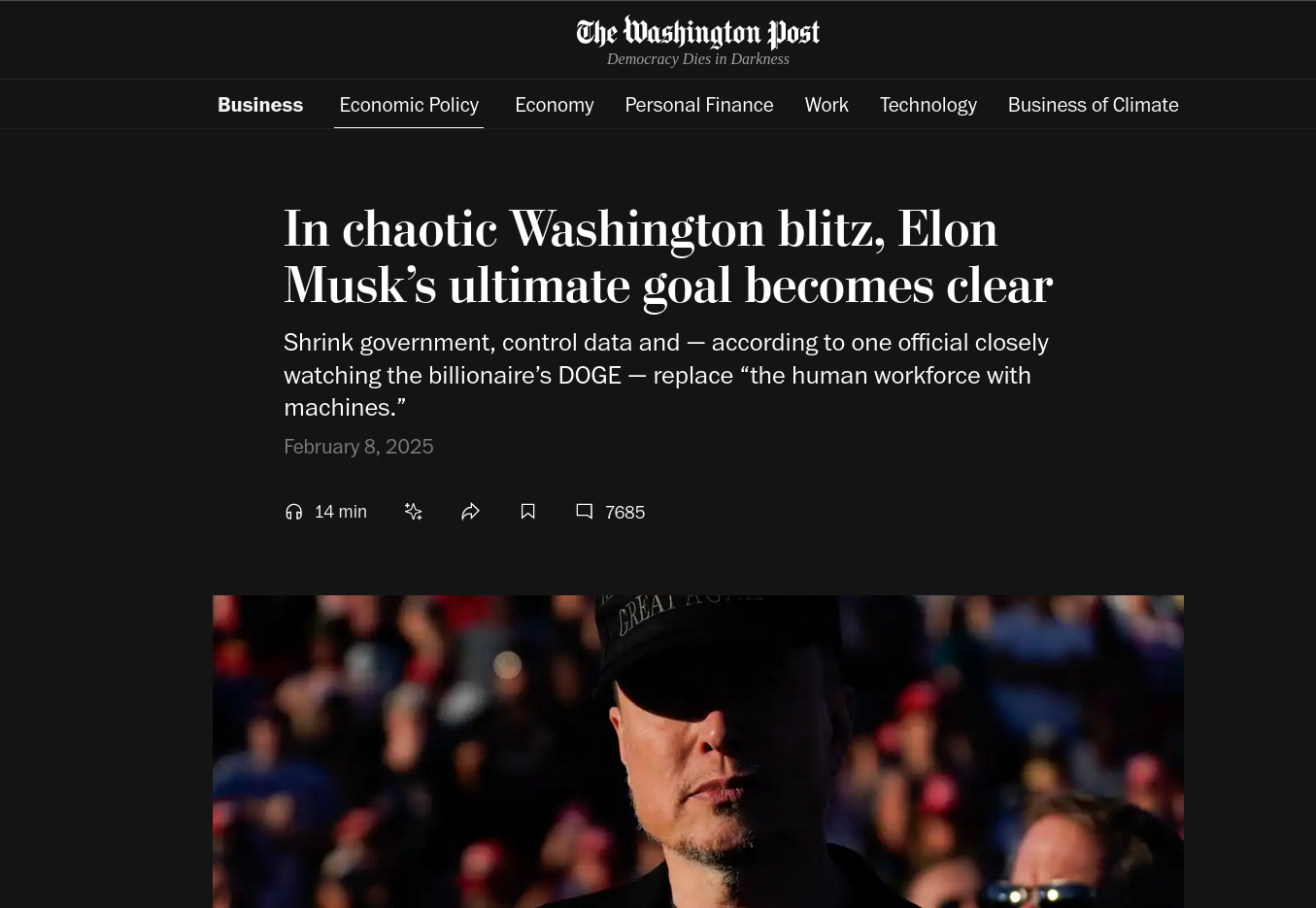 Les logiciels ne remplaceront jamais les êtres humains, et ceux qui défendent leur déploiement le savent. Tout ce que les fossoyeurs de la démocratie attendent de l'outil technique, c'est qu'il soit perçu comme un concurrent plausible du fonctionnaire le temps du remplacement de la bureaucratie par l'infrastructure. Une fois l'institution éviscérée, littéralement déshumanisée, les "IA" peuvent révéler leur nullité : non seulement ça ne fera pas revenir les employé.es, mais les broligarques de la Silicon Valley appuieront encore plus fort sur le champignon techno-solutionniste, promettant de combler les failles sociales avec des "solutions" techniques toujours plus inutiles et énergivores, dans un véritable écocide pour du vide. On apprenait, le 11 mars par Wired, qu'Elon Musk, contrairement à Trump, était en faveur d'une paralysie budgétaire gouvernementale - le fameux "shutdown", qui devrait être évité suite au vote d'un accord provisoire le 12 mars. Normal : comme les "Chicago Boys" néolibéraux des années 80 et leur "stratégie du choc", Musk cherche à provoquer et entretenir un état de crise permanent pour détruire l'édifice public autant que possible. L'intelligence artificielle n'est là que pour alimenter la diversion.