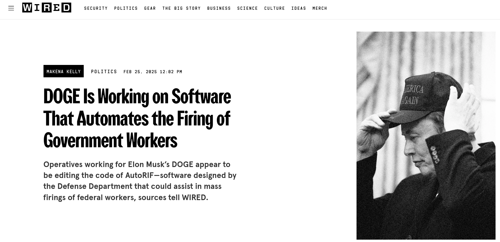 Vous vous souvenez de ces emails illégaux envoyés par les équipes de Musk à deux millions de fonctionnaires leur imposant de résumer leur travail de la semaine passée en cinq bullet points? Les réponses, révèle NBC, seront transmises à un grand modèle de langage (LLM), sans qu'on sache lequel, qui triera les indispensables des inutiles. Pire : toujours selon l'indispensable Wired, les terroristes bureaucratiques du DOGE ont mis la main sur un vieux logiciel du Département de la Défense, AutoRIF (pour "Automated Reduction in Force", ou réduction automatique des effectifs), développé au début des années 2000 pour, déjà, faciliter les licenciements, et sont en train de mettre à jour son code source.