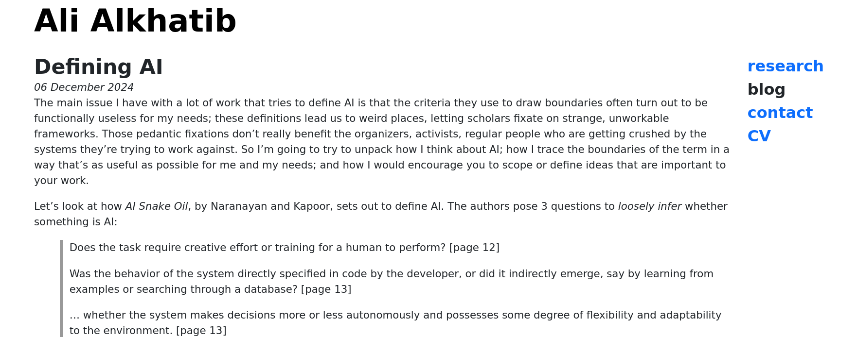 "l'IA" en tant qu'outil technique n'existe pas. L'IA telle que présentée dans la presse est depuis ses origines un mythe: celui d'une augmentation cognitive pour la techno-élite transhumaniste, en même temps qu'une réduction de l'autonomie collective par la surveillance, le calcul, la prédiction et l'automatisation. C'est, comme l'écrit Ali Alkhatib, un "projet de déplacement de l'autorité et de l'autonomie des individus vers des structures de pouvoir centralisées" typiques de l'impérialisme– un pouvoir