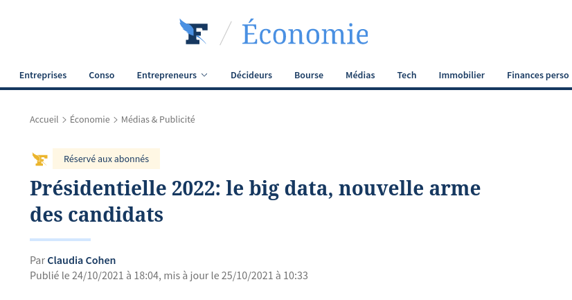 Mettez-vous à la place d'un parti politique ou, plus probablement, d'un intermédiaire, comme un courtier en données (data broker), dont le travail est de récolter des gros volumes de données et de vendre des logiciels de stratégie électorale à prix d'or aux partis politiques pour influencer des scrutins via des campagnes numériques ciblées. Depuis l'utilisation de la start-up Liegey Muller Pons (LMP) – depuis rebaptisée Explain – dans la campagne victorieuse d'Emmanuel Macron en 2017, et bien que leur influence sur le scrutin reste pour le moins limitée, ces logiciels sont incontournables. En 2022, ils s'appellent Qomon, Poligma, Hatis ; ils siphonnent les bases de données ouvertes (qui, précisons-le, ne sont pas des données personnelles) de l'Insee, de la Caf, de Pôle emploi et de tout ce qui leur tombe sous la main pour, in fine, permettre aux partis d'envoyer des mails de propagande électorale sur-mesure aux électeurs indécis. Le "fichier client" d'Elyze, à trois mois du premier tour de la présidentielle, va forcément les intéresser. Et s'ils ne peuvent pas directement l'acheter, qui dit qu'ils ne tenteront pas de se faire passer pour un organisme de recherche scientifique pour l'obtenir gratuitement ?