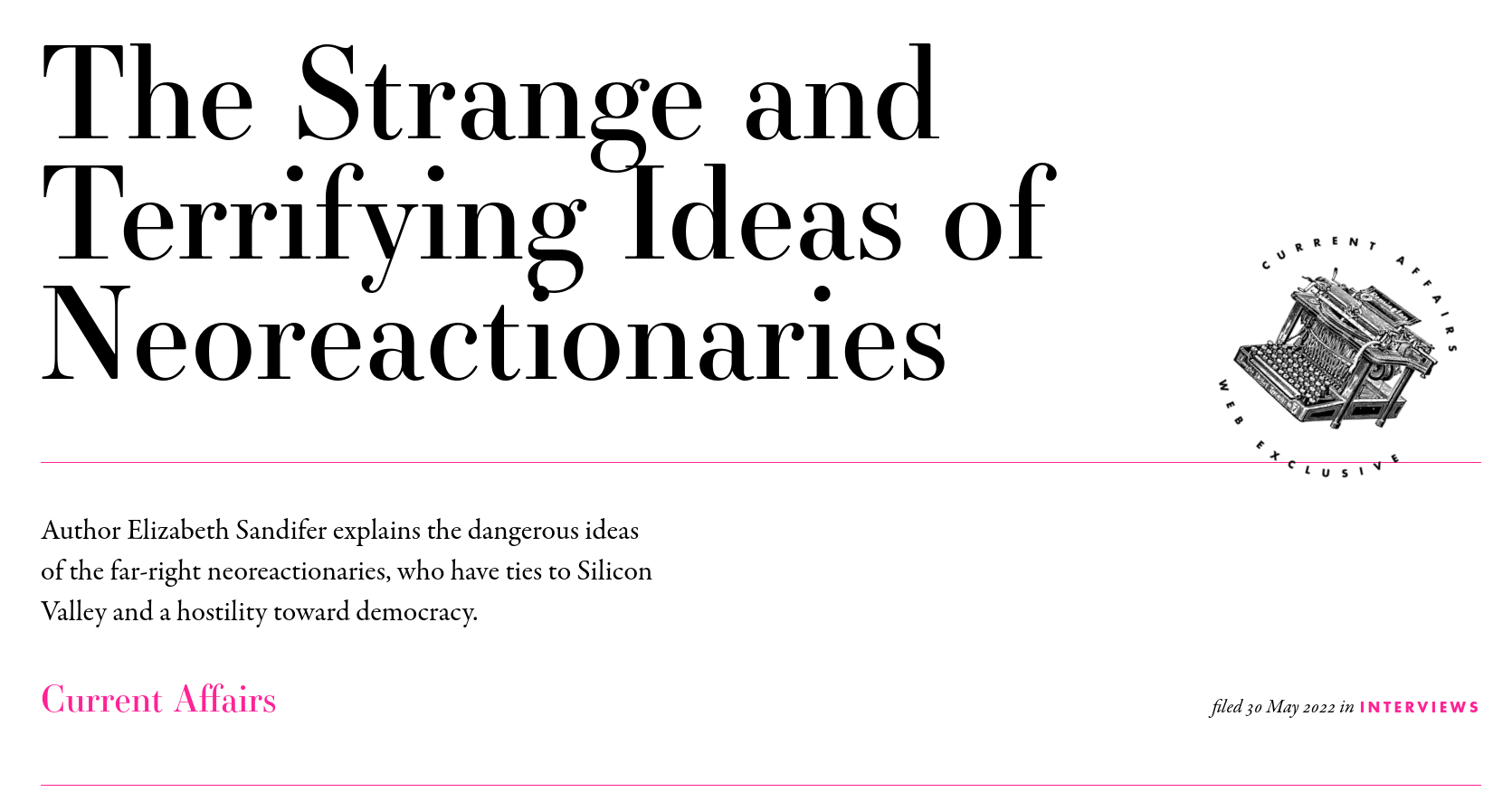 Le réacteur idéologique de la New Right s'appelle la Néo-réaction, souvent abréviée en "NRx". Comme le résume Elizabeth Sandifer, autrice de l'enquête Neoreaction a Basilisk : Essays on and around the Alt-Right et dont le podcast vaut le détour, la Néo-réaction est "une tentative de l'extrême-droite moderne - appelons ça du fascisme - pour se doter d'une base intellectuelle". Ses deux théoriciens majeurs sont Nick Land et surtout Curtis Yarvin, longtemps connu sous le pseudonyme de Mencius Moldbug. Présent dans les tréfonds de la fachosphère en ligne depuis la fin des années 2000, le blogueur Yarvin voit progressivement la lumière du mainstream à partir de 2016, lorsque Steve Bannon reprend et diffuse ses idées pour structurer l'alt-right, sa cousine beaucoup moins intello et beaucoup plus trollesque.