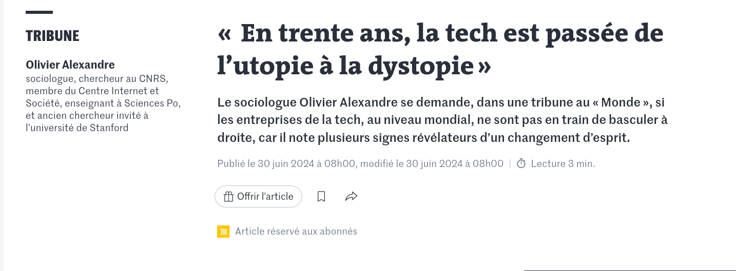 Contrairement à 2016 et 2020, Thiel n'est plus tout seul. Comme le constatait récemment (et à mots extrêmement mesurés) le sociologue Olivier Alexandre, les barons de la Silicon Valley, jadis hérauts de la mondialisation et de l'expression publique, ont enfilé leurs plus belles casquettes MAGA, signé leurs plus beaux chèques, et financent désormais ouvertement un parti nationaliste, lui-même dominé par une cohorte de néo-fascistes. Des élites liées par la conviction que la démocratie parlementaire est un système (d'exploitation) obsolète, à mettre à jour d'urgence, de préférence en installant une ploutocratie autoritaire à la place. Et à l'intersection de tous ces milieux : J.D. Vance, incarnation oxymorique de cette oligarchie populiste, qui deviendra peut-être en novembre le prochain vice-président des États-Unis.