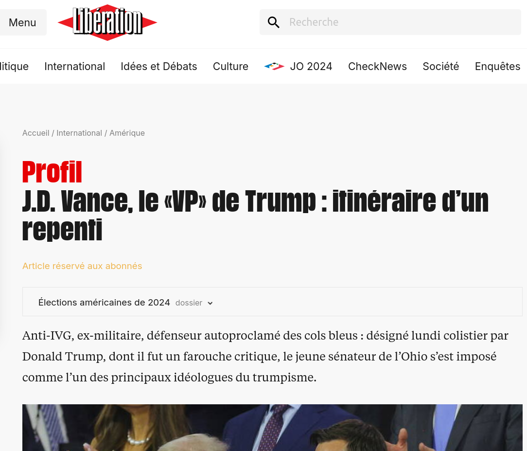 Comme un symbole, l'avenir du trumpisme n'a pas un nom mais un pseudonyme. James David Vance, dit "J.D.", 39 ans et 18 mois de carrière politique en tant que sénateur de l'Ohio, est depuis le 17 juillet le colistier officiel de Donald Trump dans la course à la présidentielle états-unienne, et le futur vice-président ("VP") en cas de victoire du camp républicain à l'automne. L'homme étant pratiquement inconnu en France jusqu'ici, excepté des spécialistes de l'extrême-droite états-unienne ou de la Silicon Valley, la presse quotidienne y est allée, en urgence, de son inévitable salve de portraits, pour tenter de cerner le bonhomme et son parcours de vie tout-terrain (ici, là, ou encore là pour vous en faire une idée).